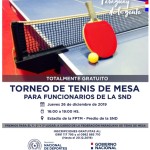 La Federación Paraguaya de Tenis de Mesa organizará el día de mañana, jueves 26 de Diciembre el Torneo de Tenis de Mesa para Funcionarios de la Secretaría Nacional de Deportes en el Estadio de la FPTM. El amistoso será desarrollado de 16:00 a 19:00hs.